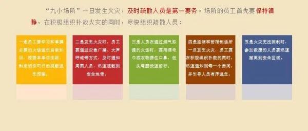 “九小場所”一旦發生火災,及時疏散人員是第一要務。場所的員工首先要保持鎮靜,第一時間撥打119報警,在積極組織撲救火災的同時,盡快組織疏散人員。