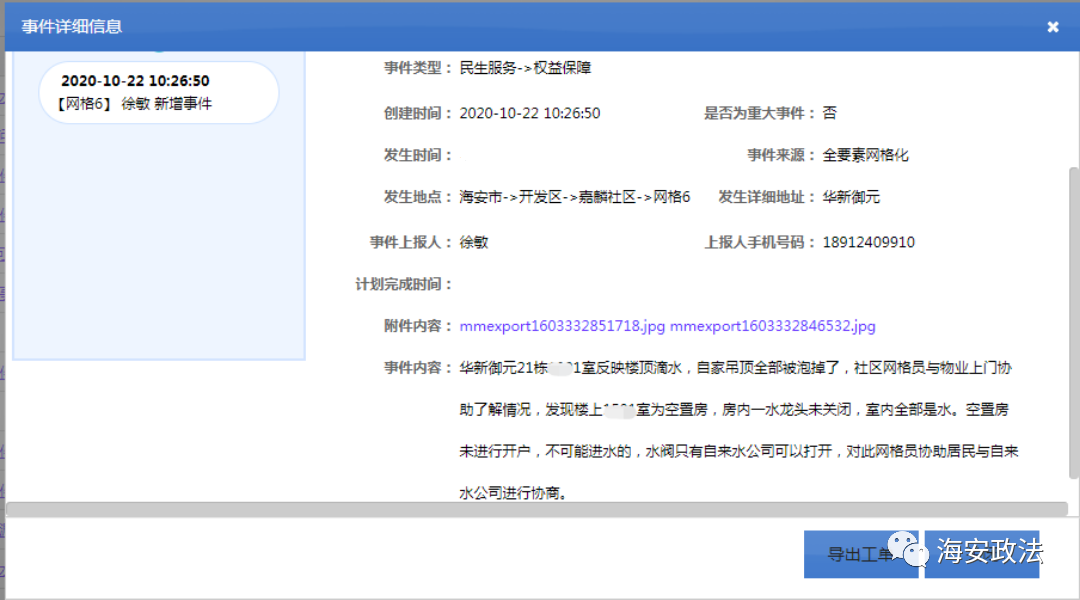 10月22日,嘉麟社區(qū)網(wǎng)格員徐敏在網(wǎng)格巡查時接到群眾反映,家住華新御元的張女士家中剛裝修的房子被樓上泡了水,導(dǎo)致裝修受損,涉及到多方責(zé)任,不知事情該如何解決。網(wǎng)格長與社區(qū)工作人員立即與物業(yè)取得聯(lián)系,并到張女士家中現(xiàn)場查看。經(jīng)核查,樓上住戶漏水148噸,張女士剛裝修好房屋多處泡毀,損失巨大。
